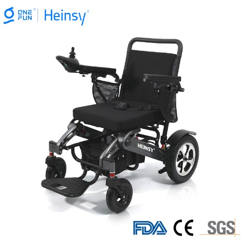 Cadeira de rodas elétrica YL-9001 : Apresenta um controlador escovado, seis sistemas de suspensão, altura ajustável do encosto, dobramento manual e um design compacto.