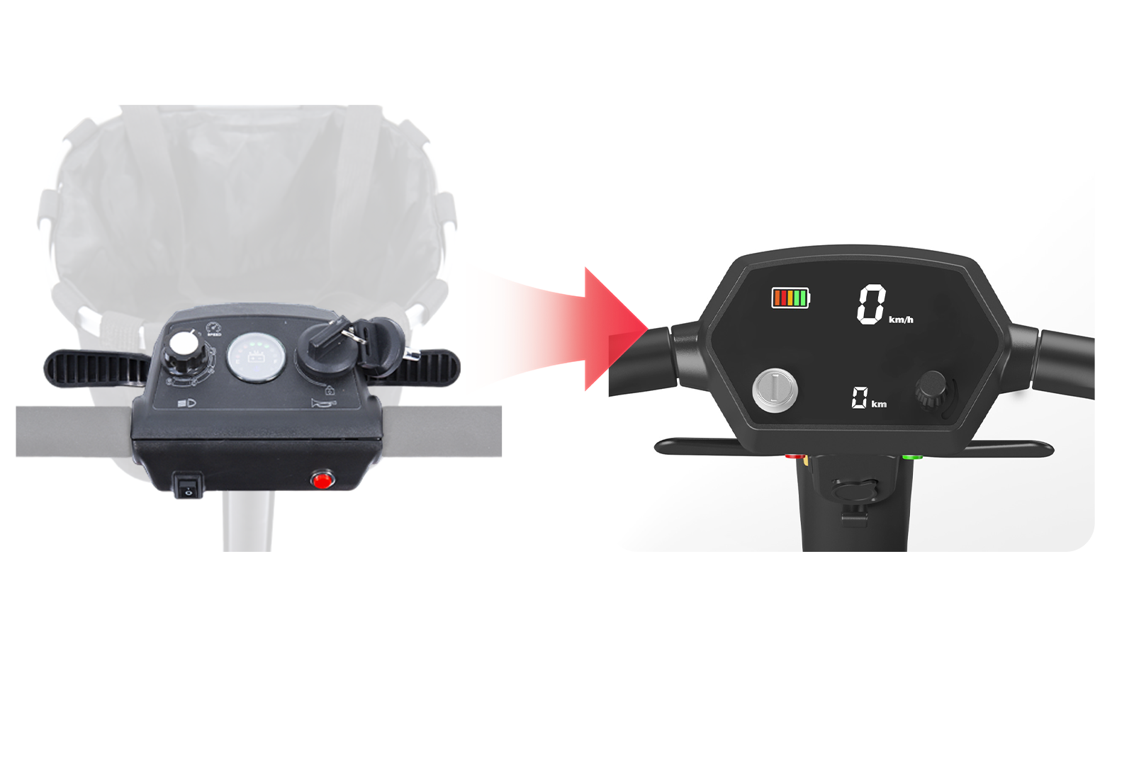 A bateria analógica original e os indicadores de velocidade não são fáceis de usar para usuários idosos com problemas de visão. A versão atualizada apresenta um display digital LED de alta definição**, exibindo com precisão a velocidade atual, bateria restante e modo de condução em tempo real. O nível da bateria é claramente indicado por três cores: verde, amarelo e vermelho, fornecendo um lembrete visual para carregar quando estiver fraca. A visualização da velocidade tem precisão de 0,1 km/h, e com o botão de ajuste de velocidade (ajustável de 2 a 8 km/h), o usuário pode controlar com mais precisão o ritmo de condução, evitando o desconforto das flutuações de velocidade.